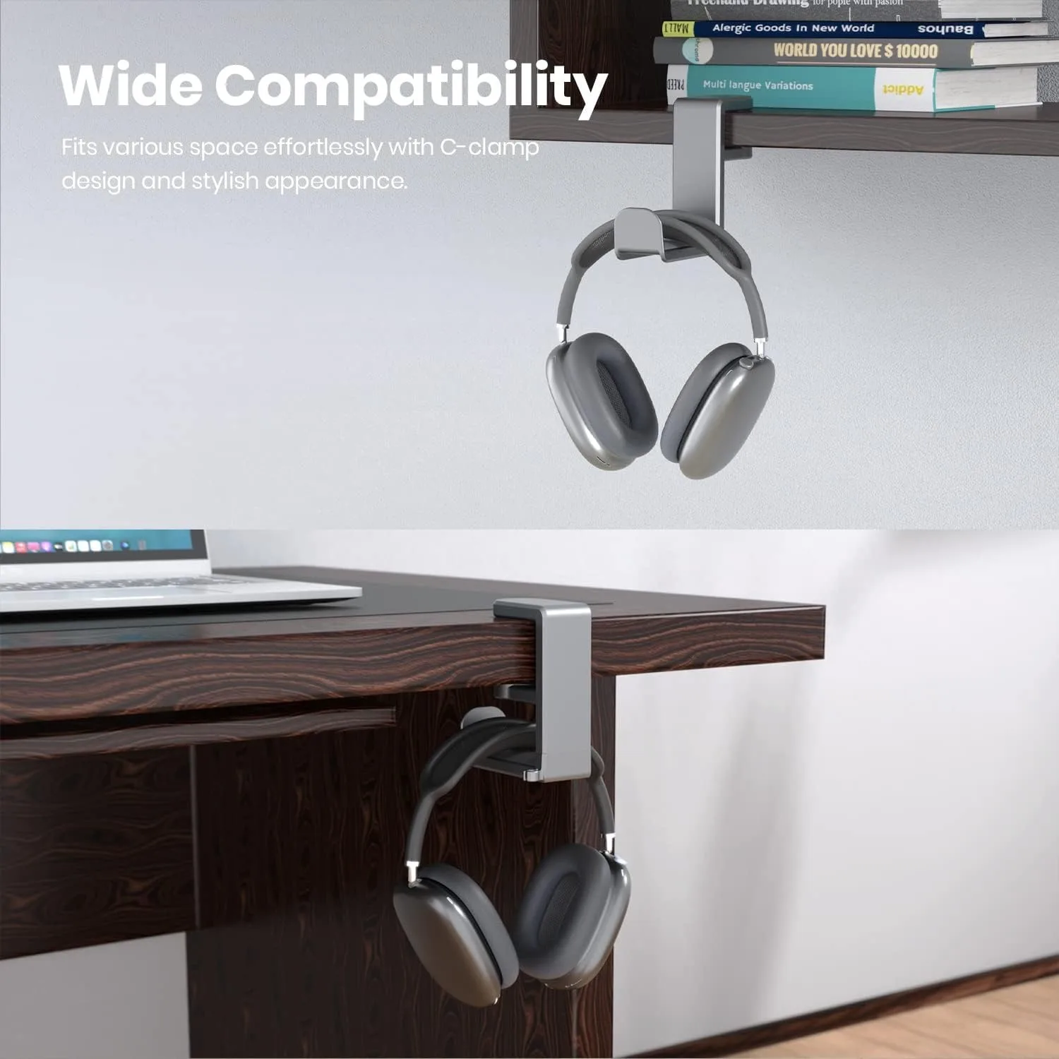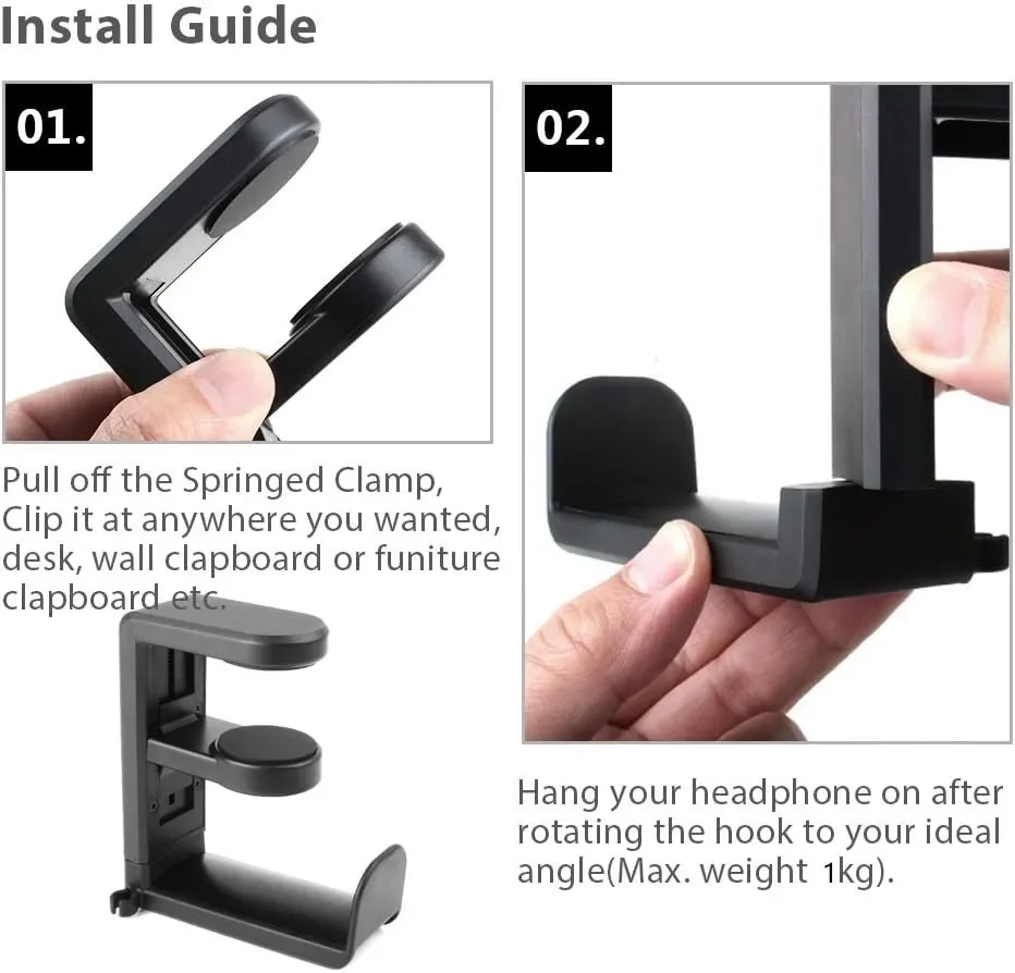 【Clamp-on Headphone Stand】Headphone holder fits desks from 0.31 inch to 1.57 inch thick, making it a versatile choice for most setups. The spring clamp is a breeze to remove and reattach. No glue, no mess. It blends seamlessly into your space, whether it’s your desk, shelf, or other surface.